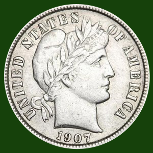 The 1907 Barber dime has two valuable mintmarks. The (S) and the (D) are both worth about $700 for dimes rated MS-63. The other two mintmarks are worth $190-$325 for similar MS-63 condition coins.