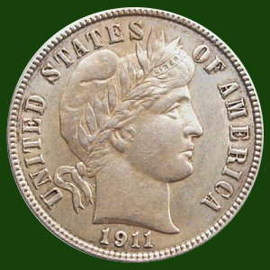 The value of the 1911 Barber dime drops compared to the previous years. With the exception of the 1913 (S) dime, this trend of low priced Barber dimes continues until 1916. This could offer a good chance for a high quality Barber dime for less than $100. Even G-4 graded coins are worth just over three times the melt value of the silver content.