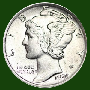 The 1920 Mercury Dime has over 93,000,000 minted giving you a great chance of finding a collectable uncirculated example. As with many of the other Mercury dimes featured up to this point, you can find a lower quality (G-4) Mercury dime for as low as $3. At that price you are paying more for the silver content that the historical value. I find that to be a good trade on your hunt for coins!