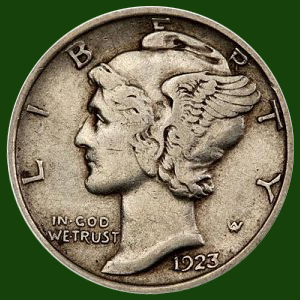 Following the depression after World War 1, the US mint only produced just over two million dimes in the two previous years combined (actually none in 1922), 1923 marks a dramatic increase in production. The Philadelphia Mint alone produced over fifty million Mercury dimes. This sudden increase in volume is reflected in the price to buy or sell a 1923 Mercury dime as well.