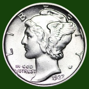 The 1937-D Mercury Dime drops another $10 in value compared to the 1936-D. An MS-63 dime with the Denver mintmark will likely cost about $40 at auction. The low cost for a F-12 condition will only cost you less than a dollar over spot (on Nov. 27, 2021).